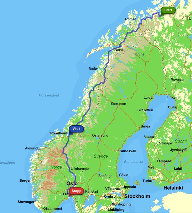 In 2009, together with one of my brothers, we drove the distance from Alta to Toensberg (Tønsberg) in + 26 hours. The distance (approximately 2000 kilometers) is indicated on the map here: